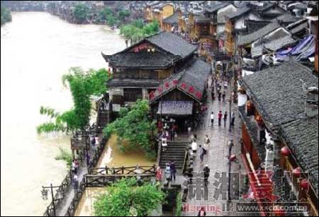 6月6日,湖南鳳凰古城景區,沱江水位猛漲