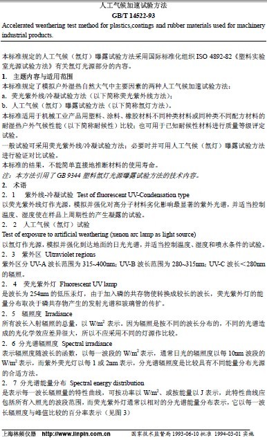GB/T 14522-93 機械工業產品人工氣候加速試驗方法:http://www.yx38800.com/uploadFile/softdown/2008103142102365.pdf