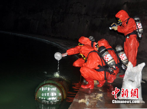 26日晚22時10分左右,四川廣元市區棲鳳路一游泳場發生氯氣泄漏事故,現場緊急疏散上千人民眾,有多人出現不同程度中毒。圖為消防官兵現場稀釋泄漏氯氣。中新社發 唐俊勇 攝 7月27日凌晨5時30分左右,經過50多名消防官兵7個多小時的連夜鏖戰險情已被成功排除。26日晚22時10分左右,四川廣元市區棲鳳路一游泳場發生氯氣泄漏事故,現場緊急疏散上千人民眾,有多人出現不同程度中毒,已被送往當地人民醫院救治,均無生命危險。圖為消防官兵現場稀釋泄漏氯氣。
